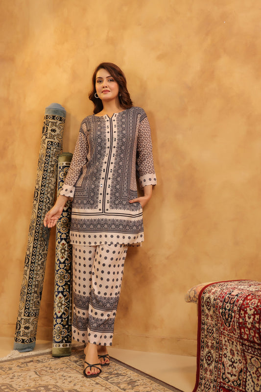 Pin-Thrust Handwork Blue Printed Co-ord Sets
