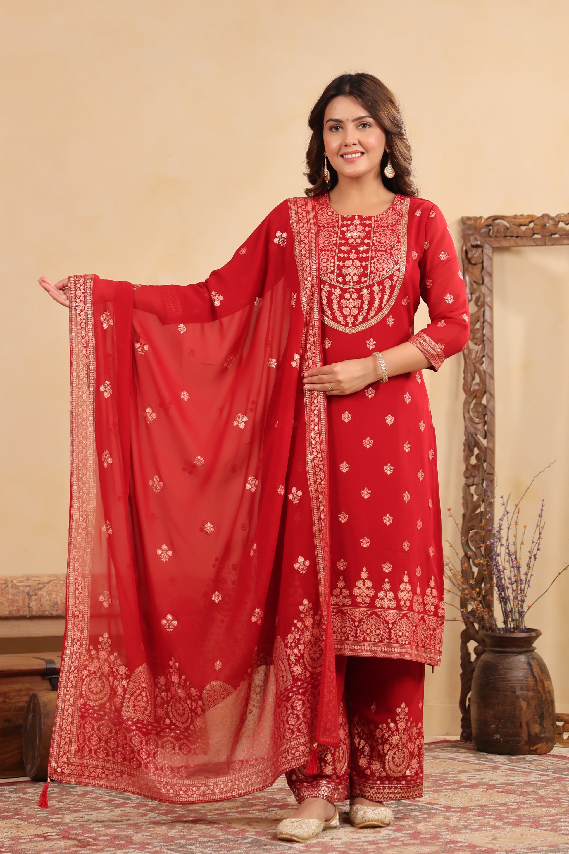 Maroon Red Georgette Handwork 3-Pcs Suit Set