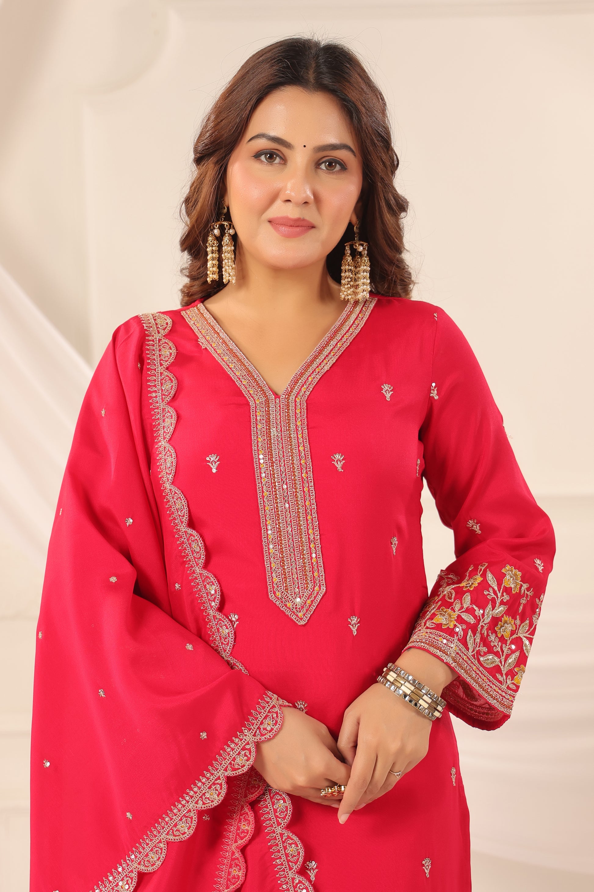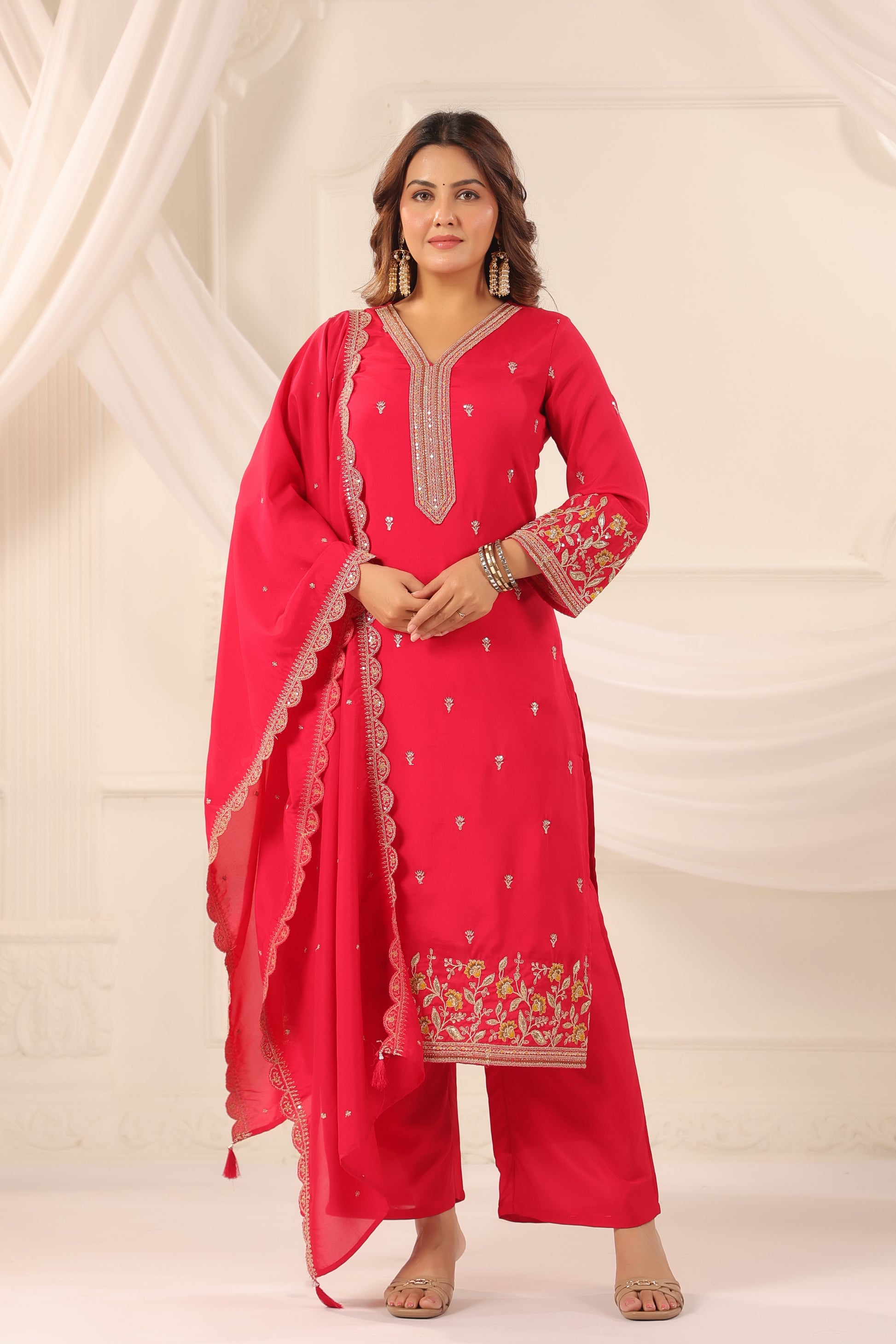 Persian Red Floral Embroidered 3-Pcs Suit Set