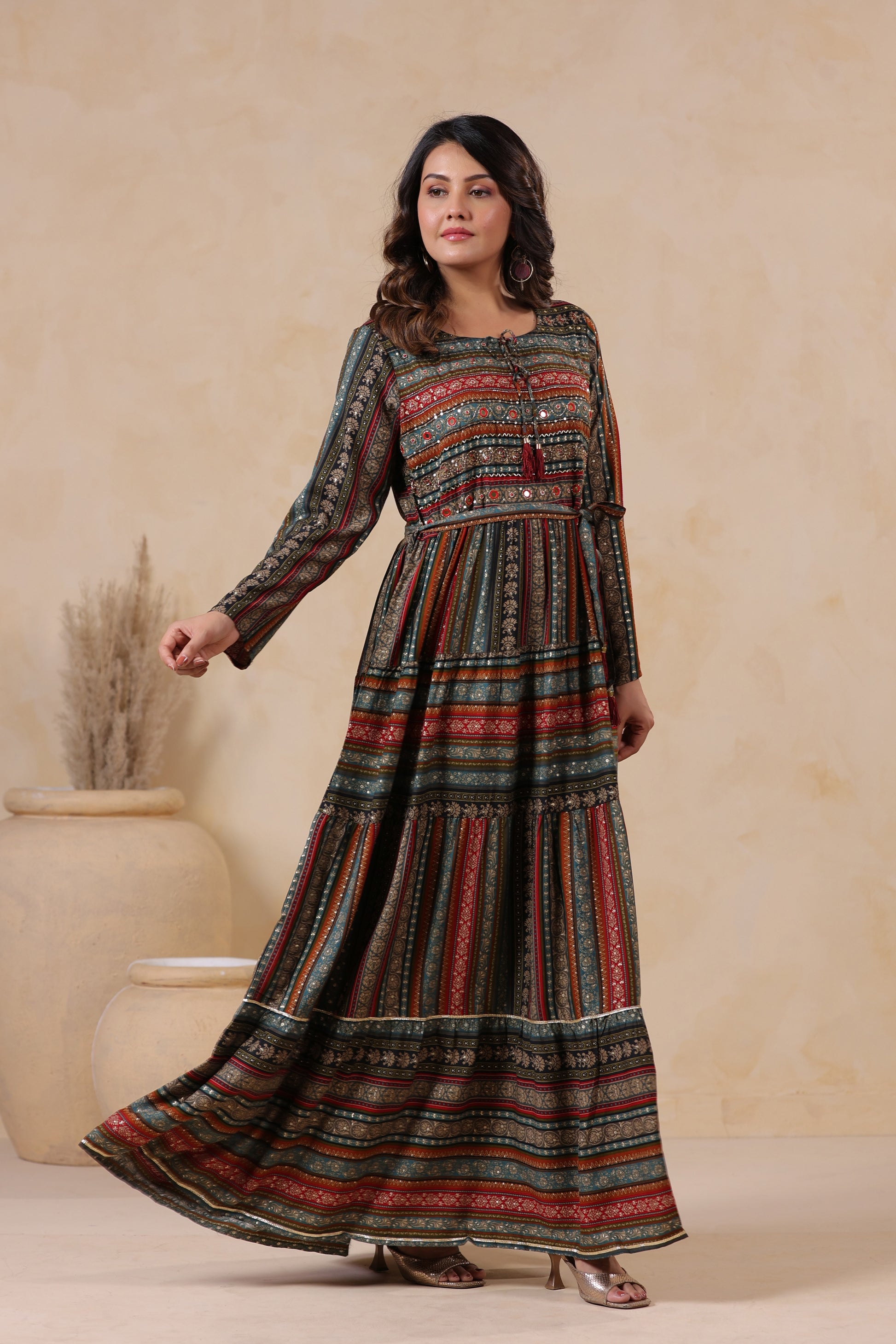 Slate Grey Stripe Handwork Flair Gown