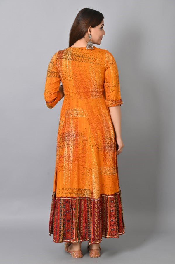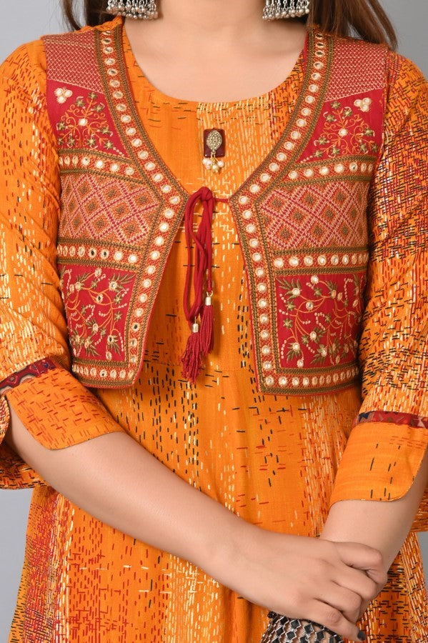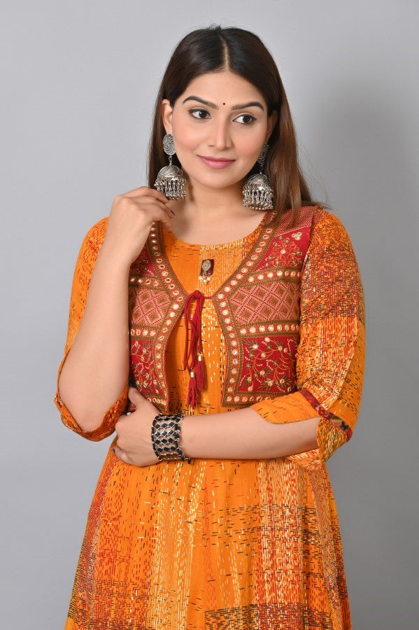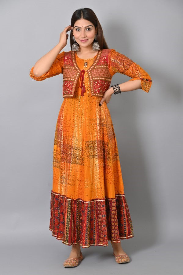 Embroidery Jacket Flair Gown With Frill and Gotta Lace Detailings and 3/4th Sleeve Length with Cuffed Sleeve Pattern.